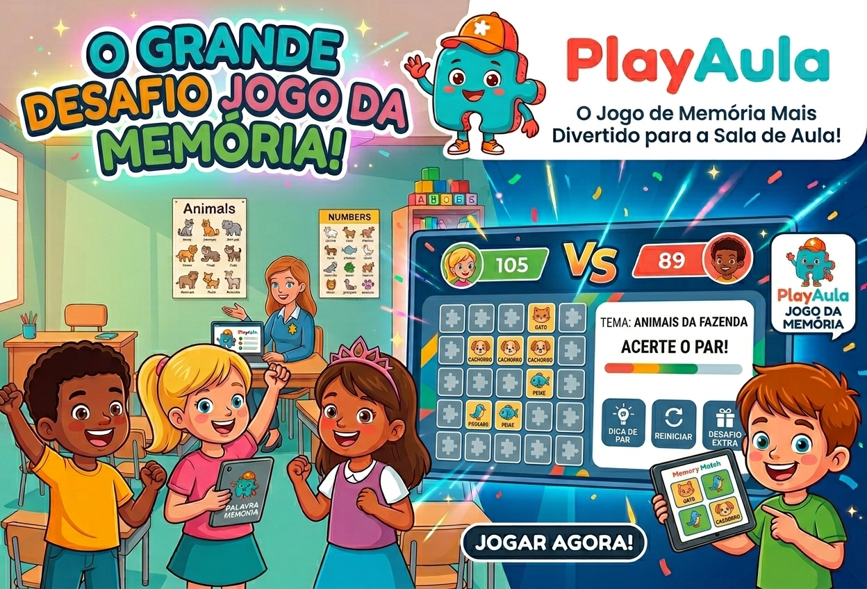Cada jogo gera um código (PIN) e um link. Você usa o painel do professor no computador ou projetor; os alunos entram pelo navegador do celular, escolhem nome e avatar e acompanham as rodadas no ritmo que você conduzir.